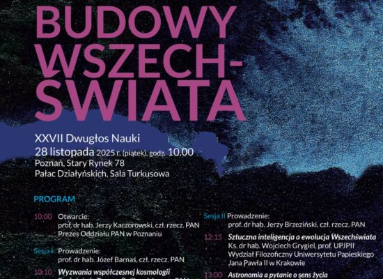 Oddział Polskiej Akademii Nauk w Poznaniu uprzejmie zaprasza na OTWARTĄ – XXVII sesję naukową z cyklu Dwugłos Nauki – pod tytułem: „Koncepcja budowy Wszechświata”. Tegoroczny XXVII Dwugłos Nauki poświęcony będzie zagadnieniu „Koncepcja budowy wszechświata”. Wykłady obejmą interdyscyplinarne spojrzenie na współczesną kosmologię, odkrycia dokonane dzięki Kosmicznemu Teleskopowi Jamesa Webba, a także refleksję nad miejscem człowieka i sztucznej inteligencji w ewolucji wszechświata. Spotkanie tradycyjnie […]