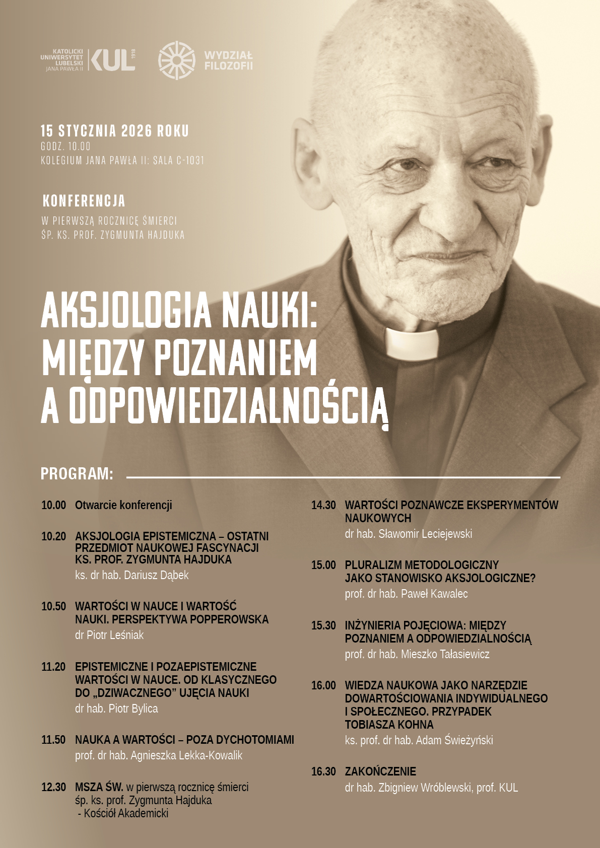 Konferencja została zaplanowana jako wydarzenie o szczególnym charakterze – odbywa się w pierwszą rocznicę śmierci śp. ks. prof. Zygmunta Hajduka, wybitnego filozofa nauki, kapłana i nauczyciela akademickiego, wieloletniego pracownika Wydziału Filozofii KUL, którego dorobek naukowy i postawa intelektualna trwale wpisały się w historię polskiej filozofii nauki. Spotkanie ma na celu nie tylko naukową refleksję nad problematyką wartości w nauce, lecz także upamiętnienie osoby i dorobku Uczonego, dla którego pytania o prawdę, racjonalność i odpowiedzialność poznawczą stanowiły trwały fundament pracy badawczej i dydaktycznej. Jego prace poświęcone zagadnieniom metodologii, racjonalności poznania oraz relacji między nauką a systemem wartości stanowią istotny punkt odniesienia dla refleksji nad odpowiedzialnością poznawczą uczonego.