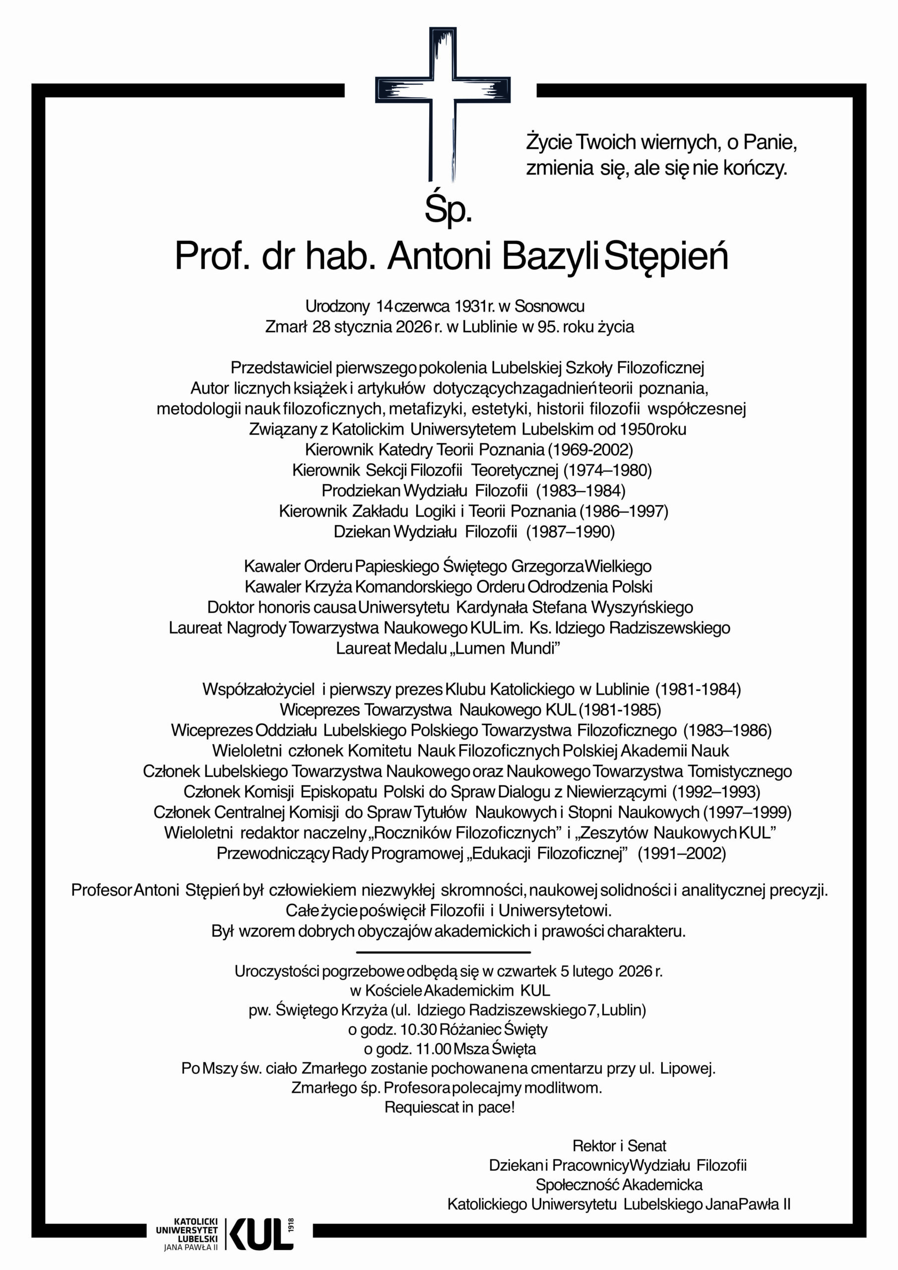 28 I 2026 r., w dzień liturgicznego wspomnienia św. Tomasza z Akwinu, zmarł Profesor Antoni Bazyli Stępień. Przeżył niespełna 95 lat. Od początków swych studiów, które rozpoczął w 1950 r., związał się z Katolickim Uniwersytetem Lubelskim. Należał do pierwszego pokolenia uczniów Lubelskiej Szkoły Filozoficznej, a potem stał się jednym z jej filarów. W swej filozofii łączył tomizm egzystencjalny Szkoły z fenomenologią Romana Ingardena oraz z tradycją analityczną Szkoły Lwowsko-Warszawskiej. Cenił otwartość filozoficzną, precyzję i zwięzłość wypowiedzi, komplementarną wieloaspektowość rozważań. Był mistrzem analiz samoświadomości, pojęciowych dystynkcji oraz podręcznikowych syntez. Jego twórczość obejmowała zagadnienia teorii poznania, metafizyki, antropologii filozoficznej, estetyki, metafilozofii i historii polskiej filozofii współczesnej. Starał się wydobyć z niej to, co najlepsze. Swe życie poświęcił Filozofii, a swą pracę akademicką traktował jako służbę Uniwersytetowi, Kościołowi i Polsce.