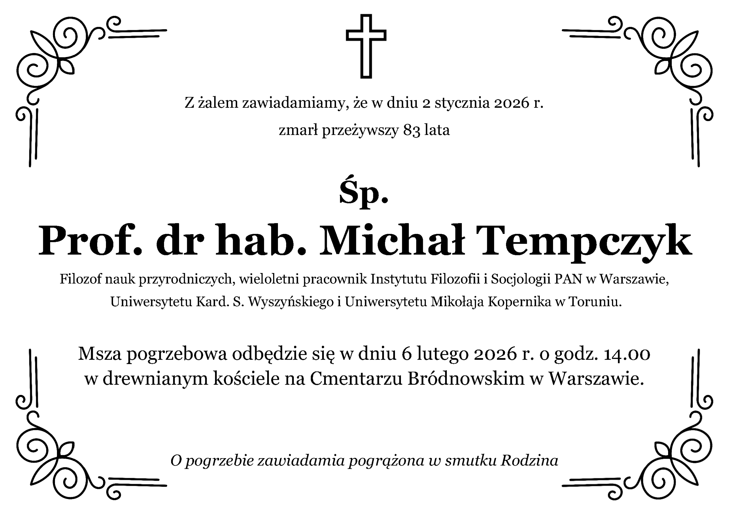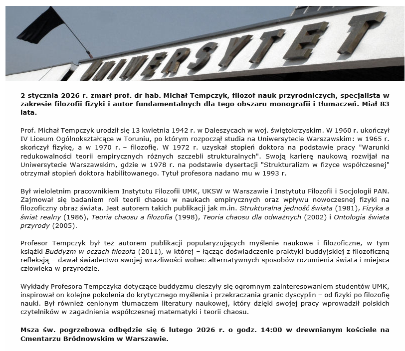 2 stycznia 2026 r. zmarł prof. dr hab. Michał Tempczyk, filozof nauk przyrodniczych, specjalista w zakresie filozofii fizyki i autor fundamentalnych dla tego obszaru monografii i tłumaczeń. Miał 83 lata.